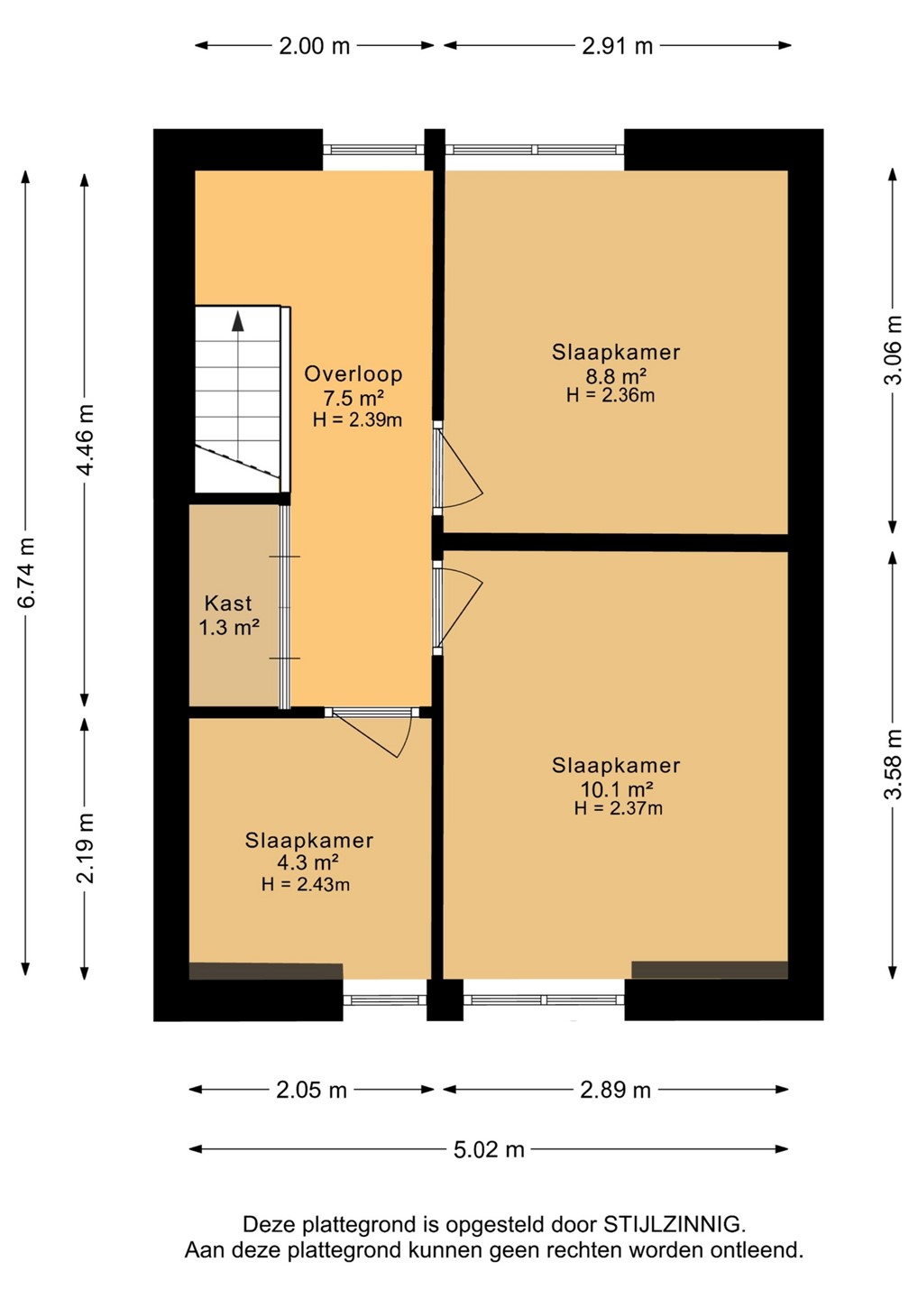 Via de ruime, lichte overloop zijn de drie slaapkamers te bereiken van ca. 4, 9 en 10 m². Ook hier valt de hoge kwaliteit van de afwerking op! De kamers zelf zijn mooi licht en voorzien van een fraaie laminaatvloer. Bovendien is er extra opbergruimte gecreëerd met de grote inbouwkast die vanuit de overloop te bereiken is.
