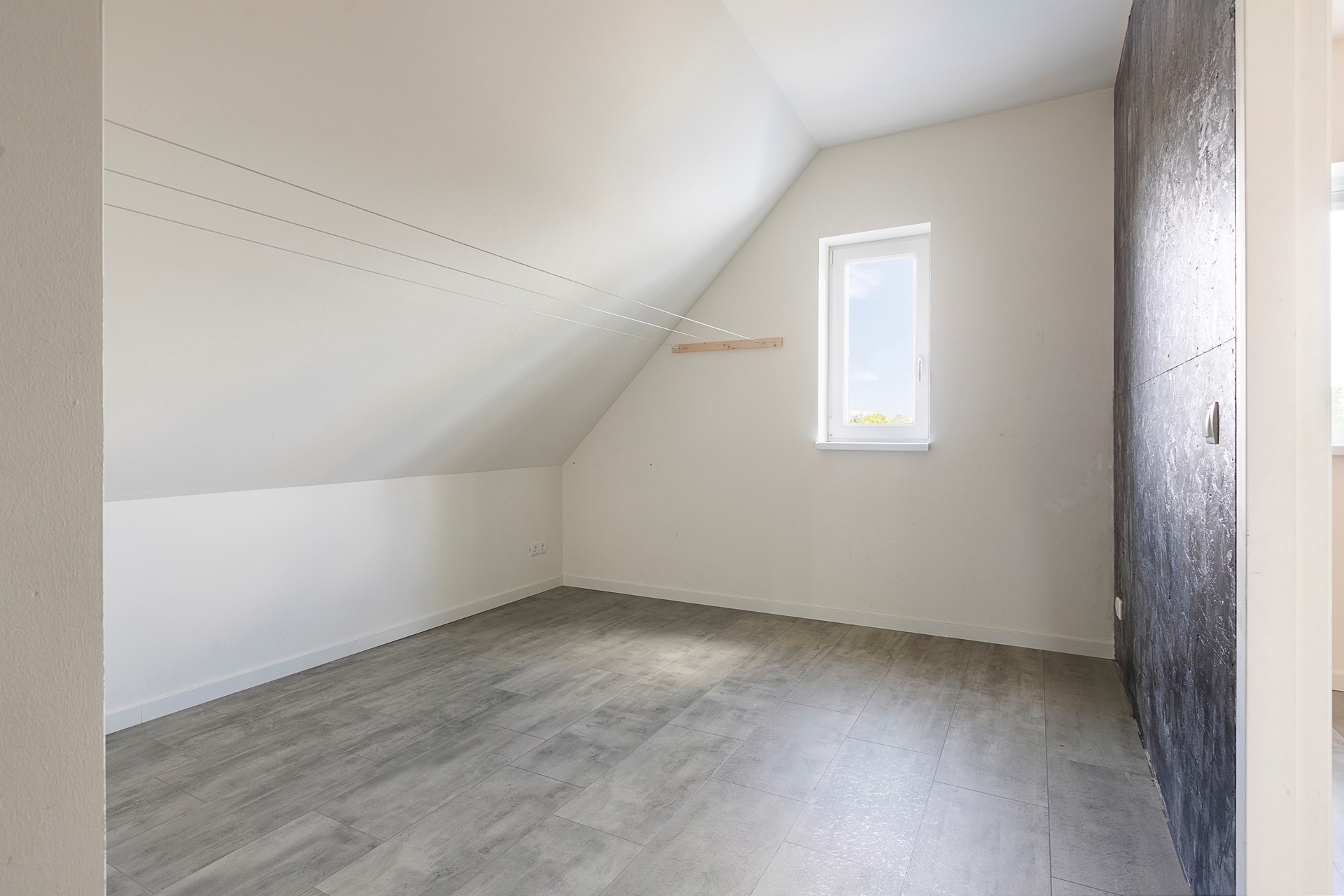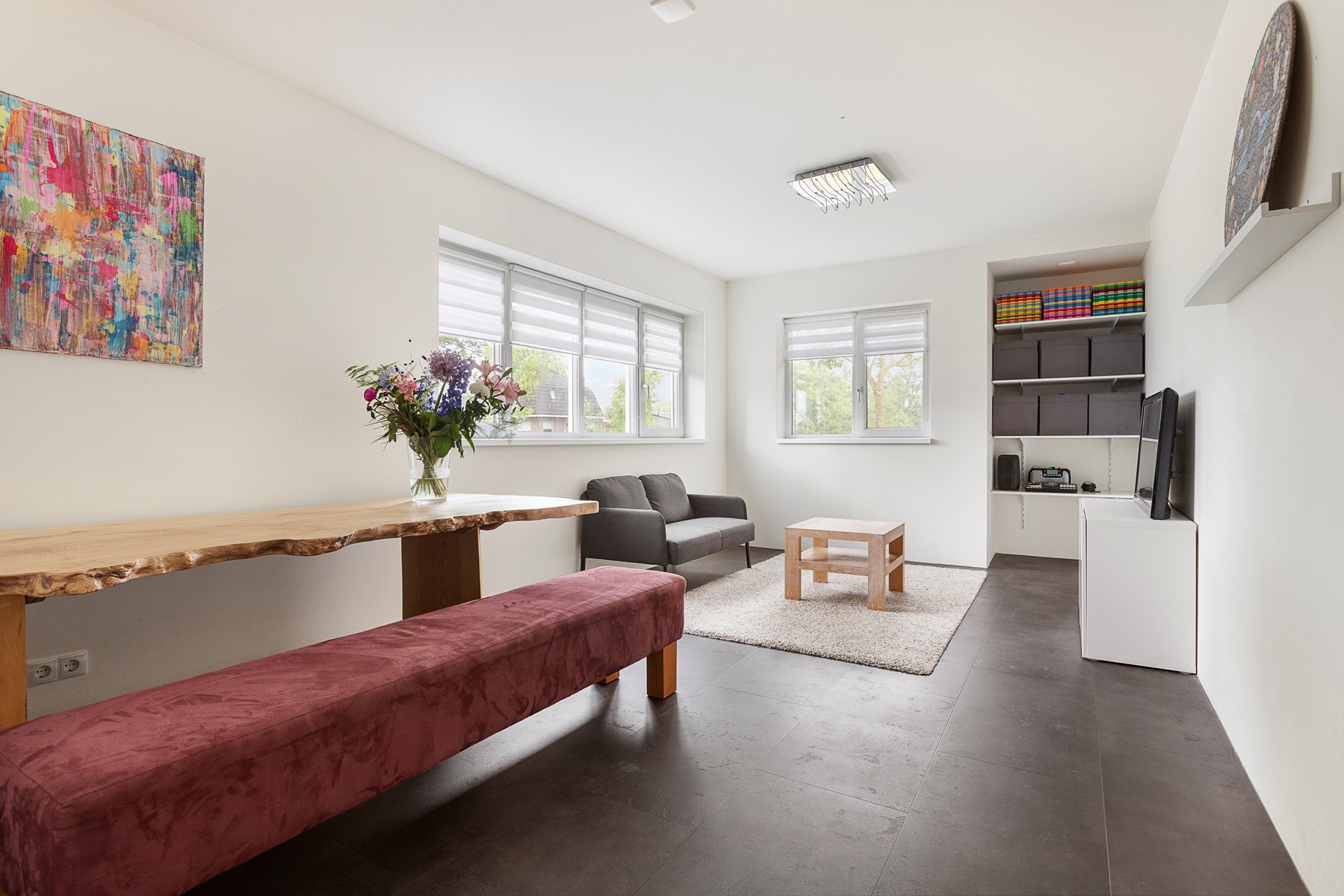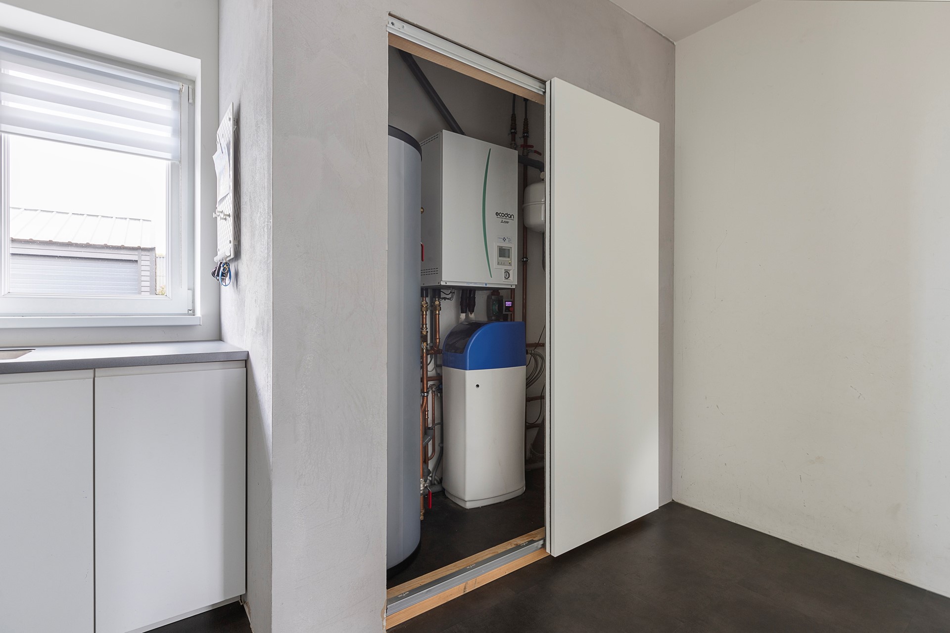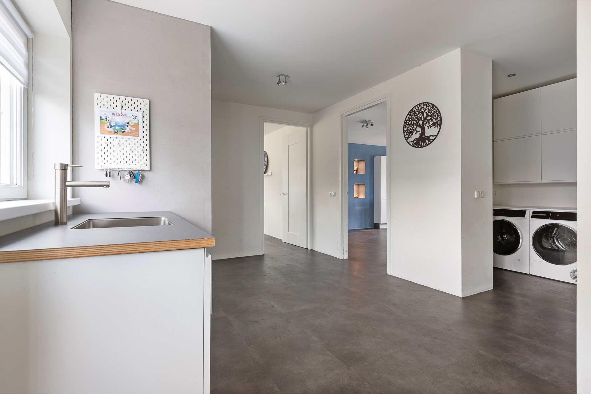 Vanuit de keuken is de zeer ruime bijkeuken te bereiken met directe toegang tot de oprit, een keukenblok, een tweede toilet, een opstelling voor de wasmachine en droger en de warmtepomp die fraai is weggewerkt achter een schuifdeur. Hier is ook de luxe badkamer met inloopdouche en dubbele wastafel met meubel te bereiken en een extra kamer die als slaapkamer kan worden gebruikt waarmee de woning levensloopbestendig is.