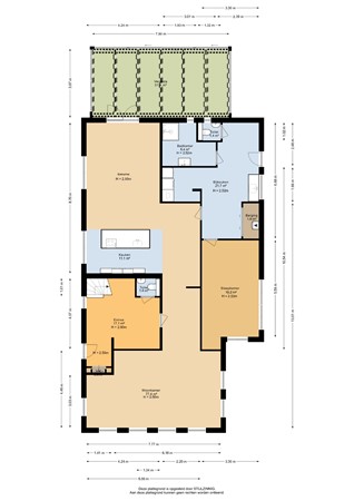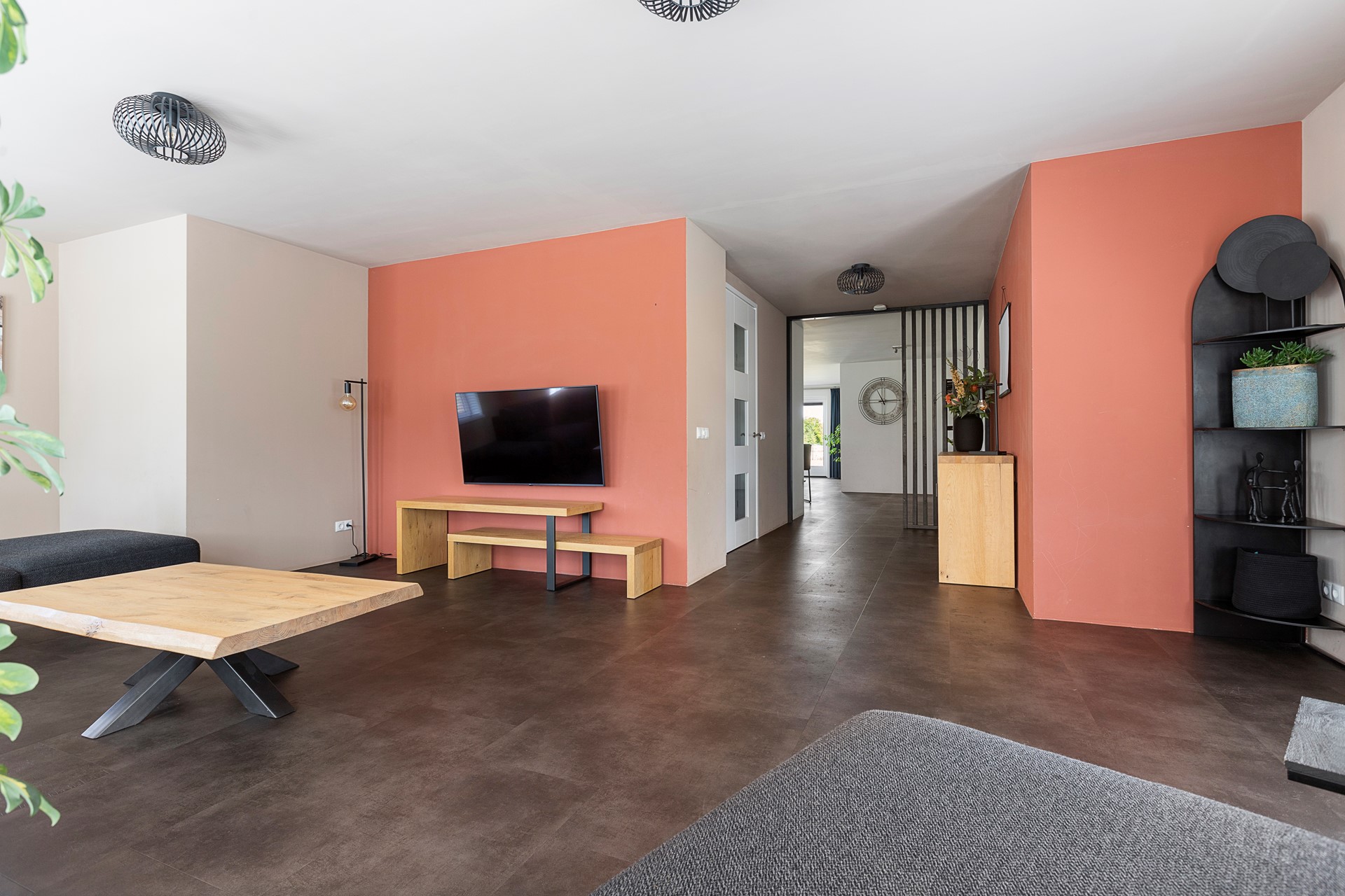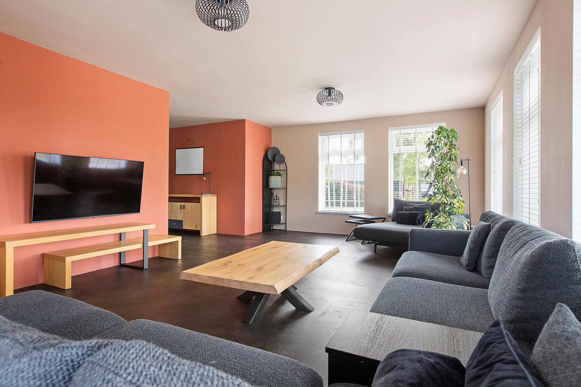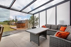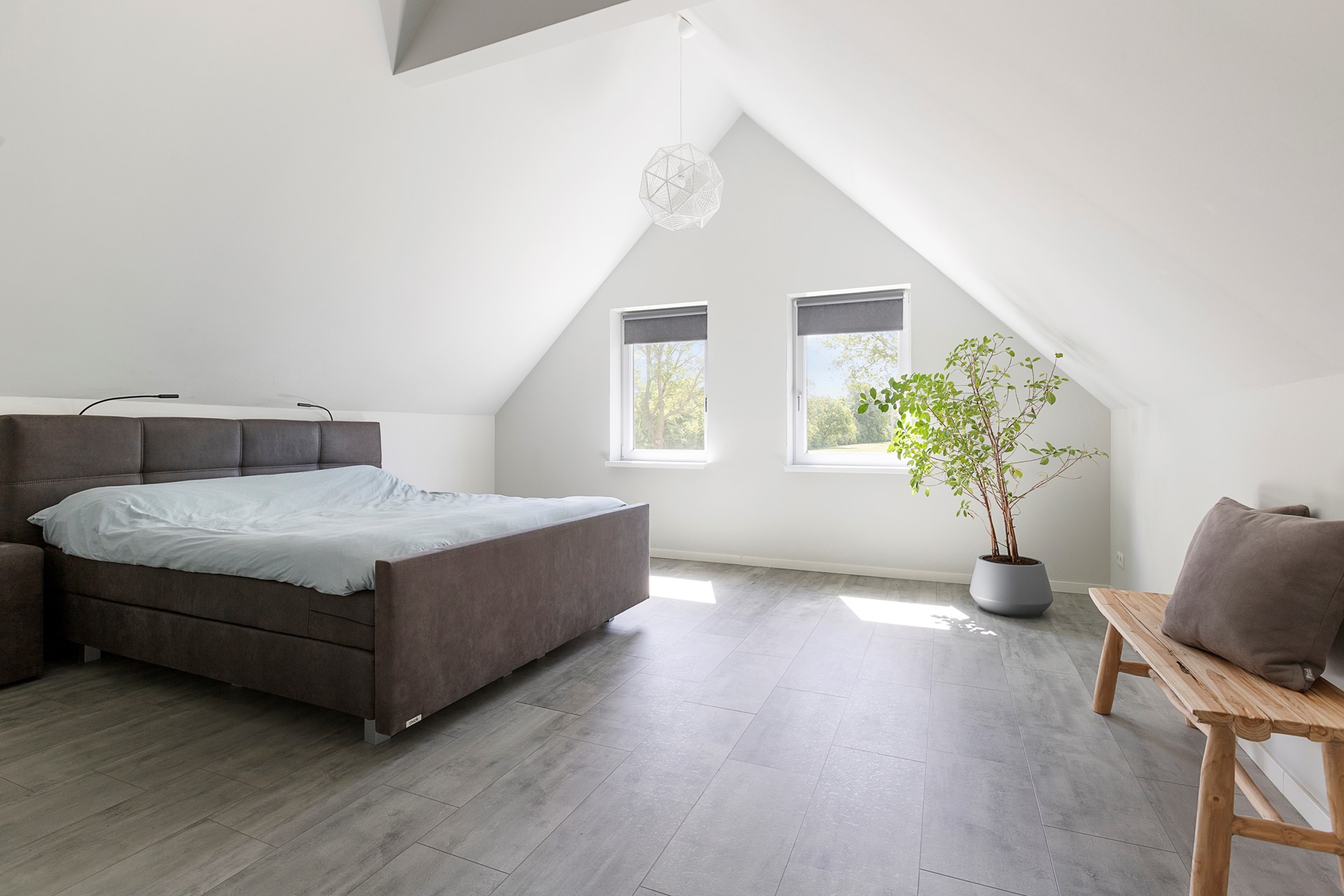 Vanuit de keuken is de zeer ruime bijkeuken te bereiken met directe toegang tot de oprit, een keukenblok, een tweede toilet, een opstelling voor de wasmachine en droger en de warmtepomp die fraai is weggewerkt achter een schuifdeur. Hier is ook de luxe badkamer met inloopdouche en dubbele wastafel met meubel te bereiken en een extra kamer die als slaapkamer kan worden gebruikt waarmee de woning levensloopbestendig is.