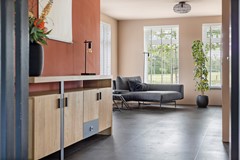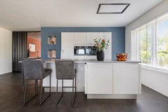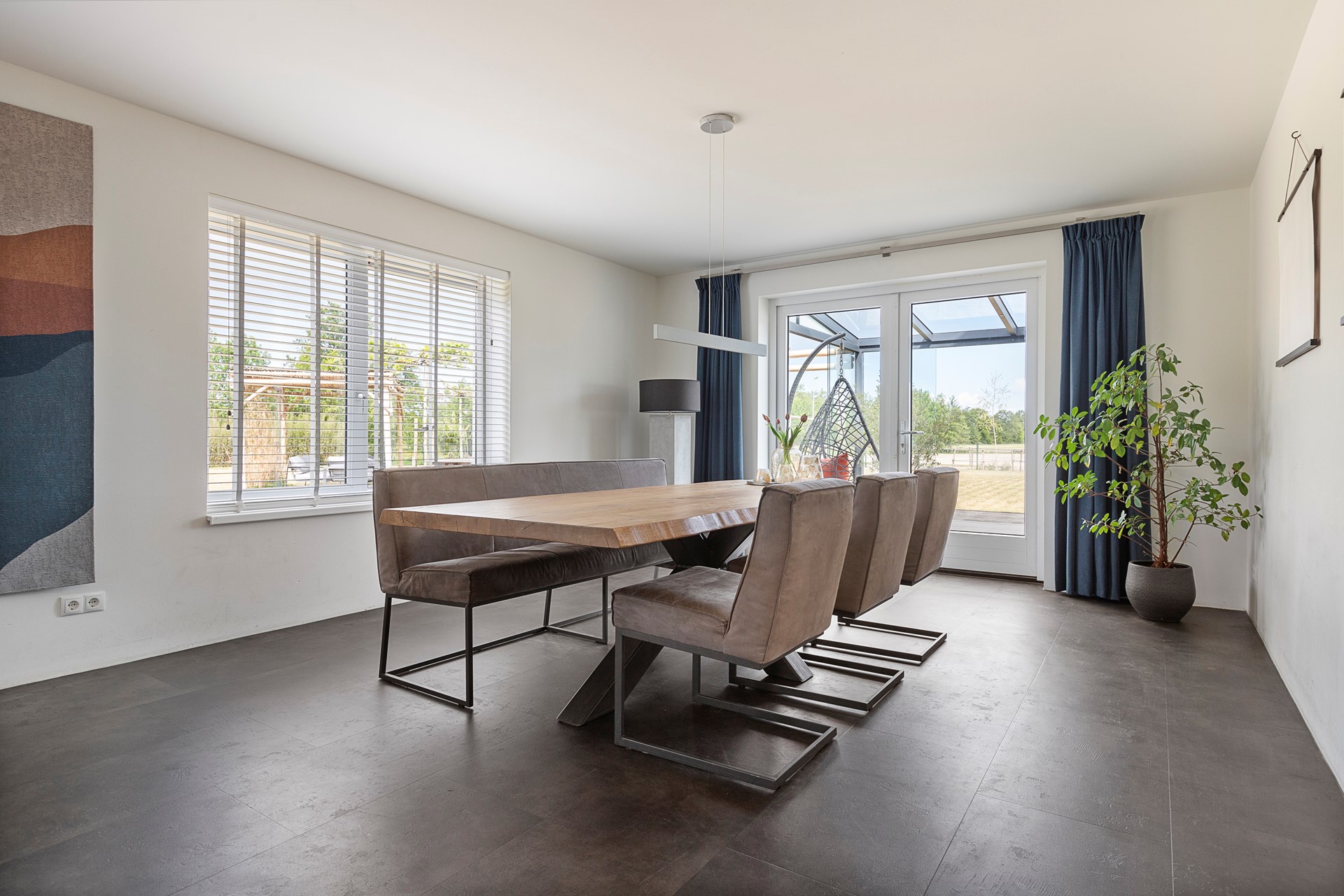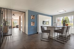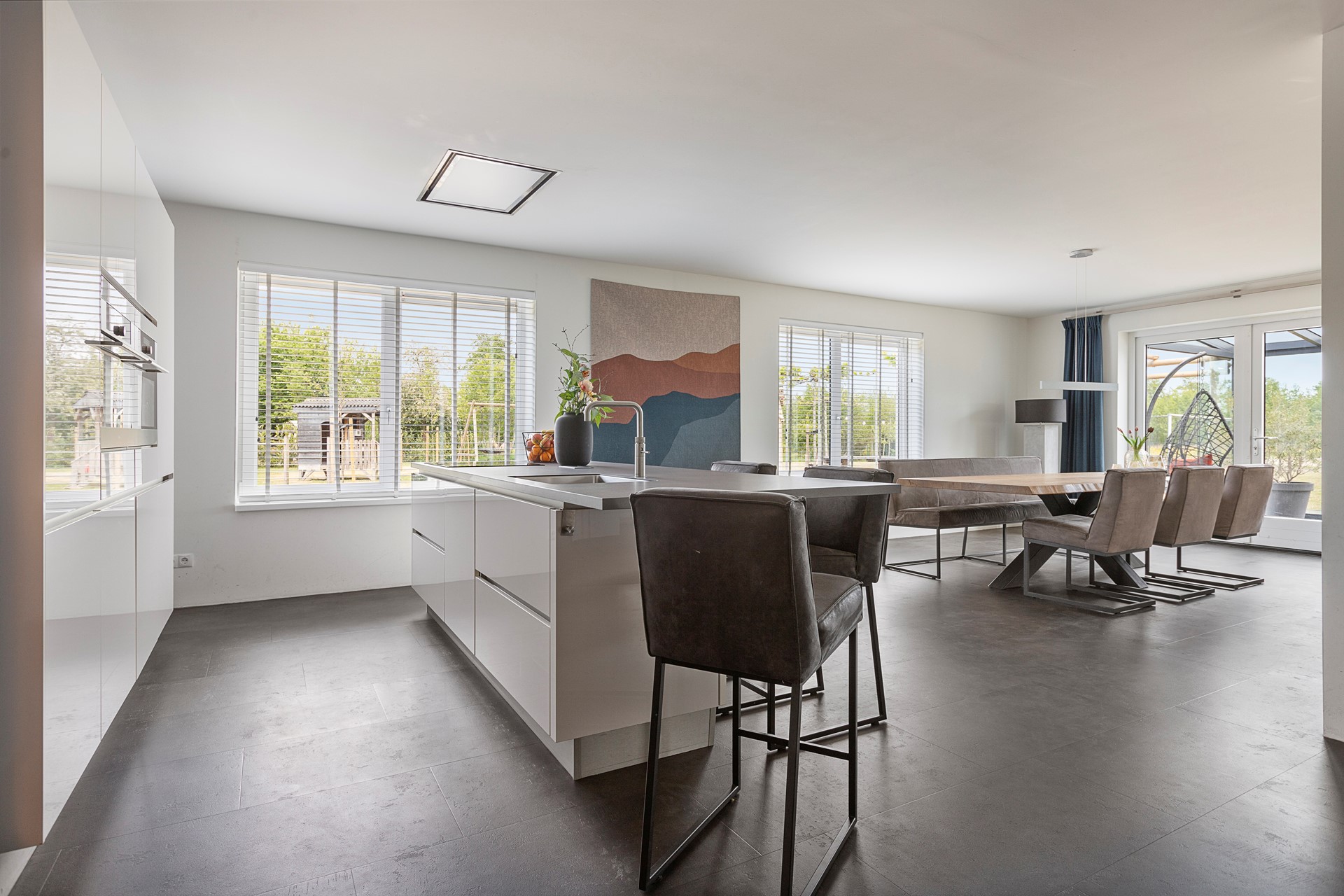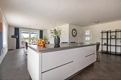 Via de zijentree komen we binnen in de ruime hal, waar zich ook de meterkast, het toilet en de trapopgang naar boven bevindt. Vervolgens lopen we door naar de ruime woonkamer aan de voorzijde van de woning. Door de vele raampartijen is dit een heerlijk lichte ruimte om in te vertoeven! Bovendien is de gehele begane grond voorzien van pvc-vloer met vloerverwarming die ook kan koelen voor extra comfort. Met een moderne, open scheidingswand is de lange ruimte naar de keuken fraai onderbroken. De keuken zelf is modern en luxe en voorzien van een kook-/spoeleiland met een bar en diverse inbouwapparatuur, zoals een inductiekookplaat, twee combi-ovens, koelkast, Quooker, vaatwasser en een afzuigkap die fraai is weggewerkt in het plafond. Daarnaast is ruimte voor een grote eettafel. Door de openslaande deuren kun je genieten van het prachtige vrije uitzicht en heb je directe toegang tot de fantastisch ruime serre met glazen schuifpui naar de tuin!