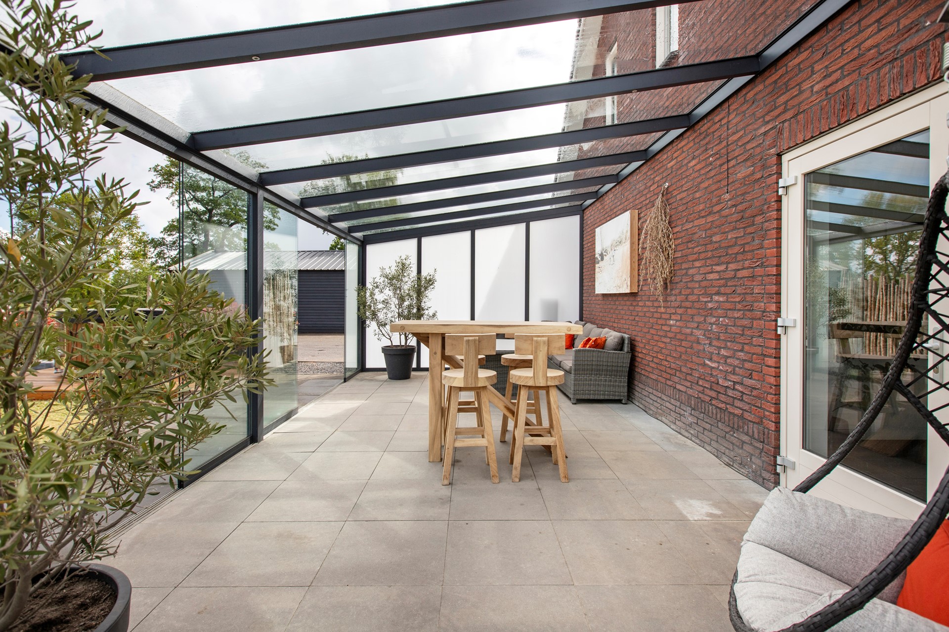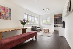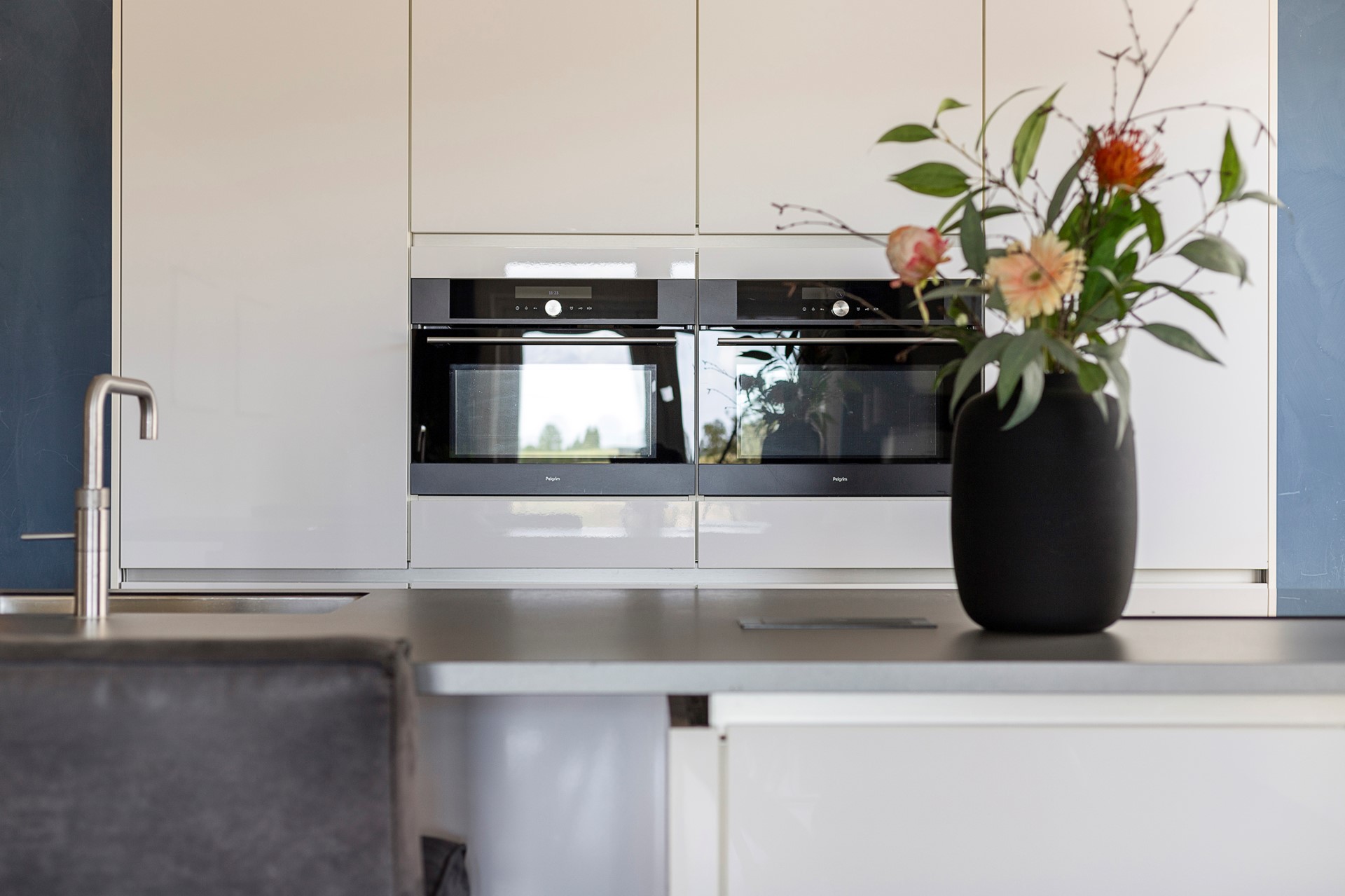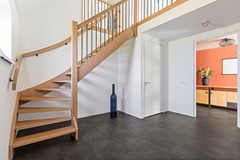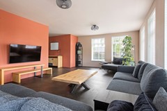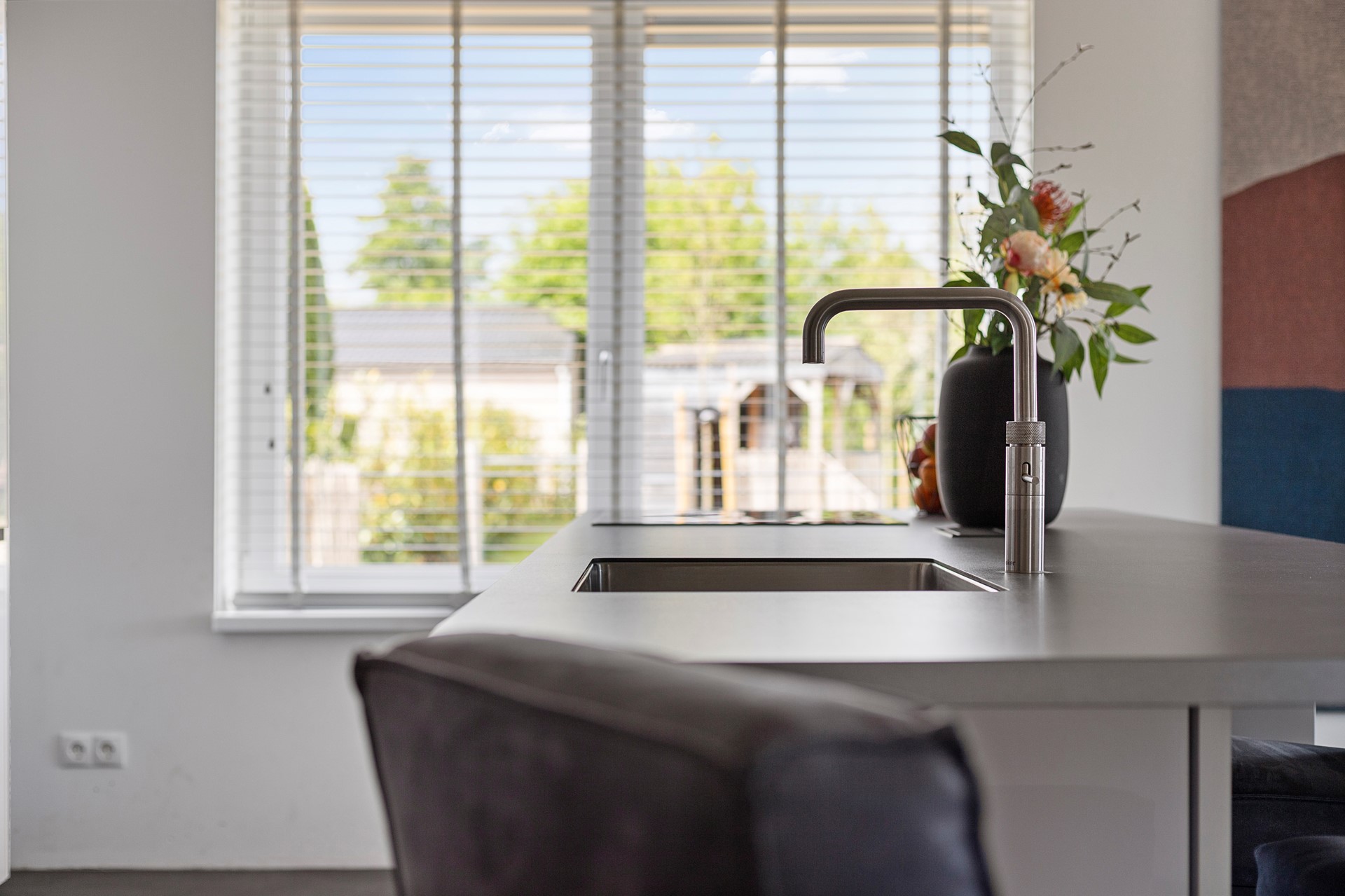 Via de zijentree komen we binnen in de ruime hal, waar zich ook de meterkast, het toilet en de trapopgang naar boven bevindt. Vervolgens lopen we door naar de ruime woonkamer aan de voorzijde van de woning. Door de vele raampartijen is dit een heerlijk lichte ruimte om in te vertoeven! Bovendien is de gehele begane grond voorzien van pvc-vloer met vloerverwarming die ook kan koelen voor extra comfort. Met een moderne, open scheidingswand is de lange ruimte naar de keuken fraai onderbroken. De keuken zelf is modern en luxe en voorzien van een kook-/spoeleiland met een bar en diverse inbouwapparatuur, zoals een inductiekookplaat, twee combi-ovens, koelkast, Quooker, vaatwasser en een afzuigkap die fraai is weggewerkt in het plafond. Daarnaast is ruimte voor een grote eettafel. Door de openslaande deuren kun je genieten van het prachtige vrije uitzicht en heb je directe toegang tot de fantastisch ruime serre met glazen schuifpui naar de tuin!