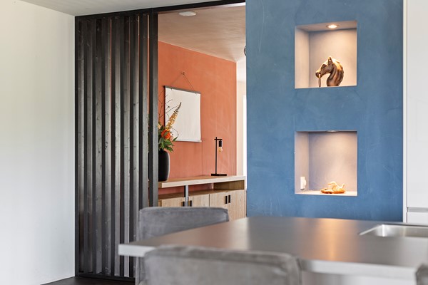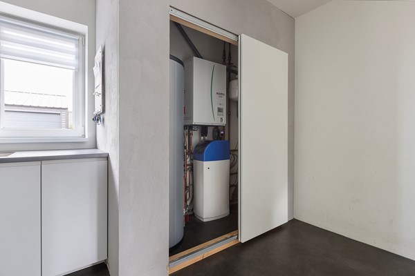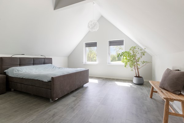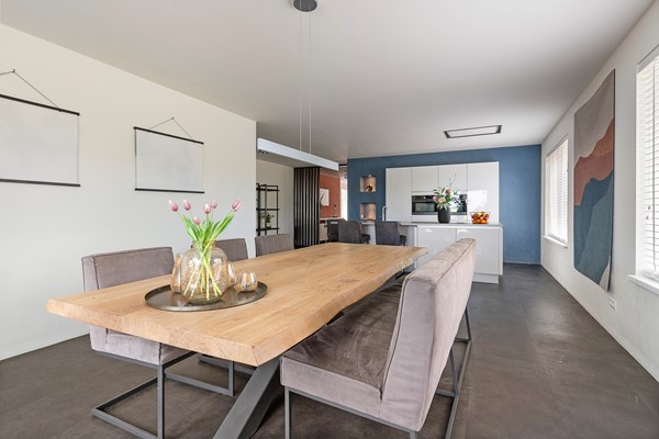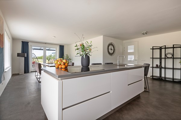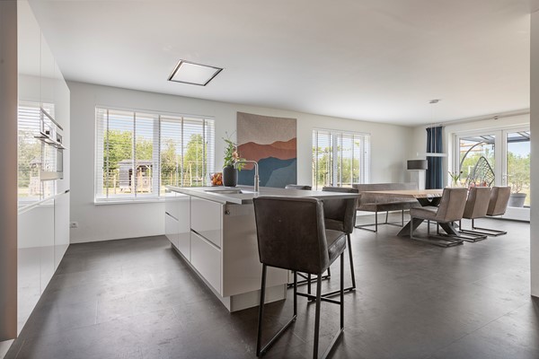 Begane grond: Via de zijentree komen we binnen in de ruime hal, waar zich ook de meterkast, het toilet en de trapopgang naar boven bevindt. Vervolgens lopen we door naar de ruime woonkamer aan de voorzijde van de woning. Door de vele raampartijen is dit een heerlijk lichte ruimte om in te vertoeven! Bovendien is de gehele begane grond voorzien van pvc-vloer met vloerverwarming die ook kan koelen voor extra comfort. Met een moderne, open scheidingswand is de lange ruimte naar de keuken fraai onderbroken. De keuken zelf is modern en luxe en voorzien van een kook-/spoeleiland met een bar en diverse inbouwapparatuur, zoals een inductiekookplaat, twee combi-ovens, koelkast, Quooker, vaatwasser en een afzuigkap die fraai is weggewerkt in het plafond. Daarnaast is ruimte voor een grote eettafel. Door de openslaande deuren kun je genieten van het prachtige vrije uitzicht en heb je directe toegang tot de fantastisch ruime serre met glazen schuifpui naar de tuin! Vanuit de keuken is de zeer ruime bijkeuken te bereiken met directe toegang tot de oprit, een keukenblok, een tweede toilet, een opstelling voor de wasmachine en droger en de warmtepomp die fraai is weggewerkt achter een schuifdeur. Hier is ook de luxe badkamer met inloopdouche en dubbele wastafel met meubel te bereiken en een extra kamer die als slaapkamer kan worden gebruikt waarmee de woning levensloopbestendig is.